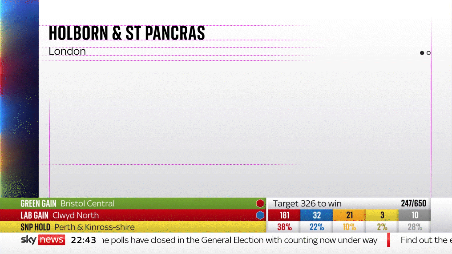 To present results for 650 constituencies clearly, I created dynamic reshuffling graphics and automated result straps. To ensure a consistent visual approach, simple gradients were used to emphasise the data, with embellishments reserved for key moments such as declaring winners.